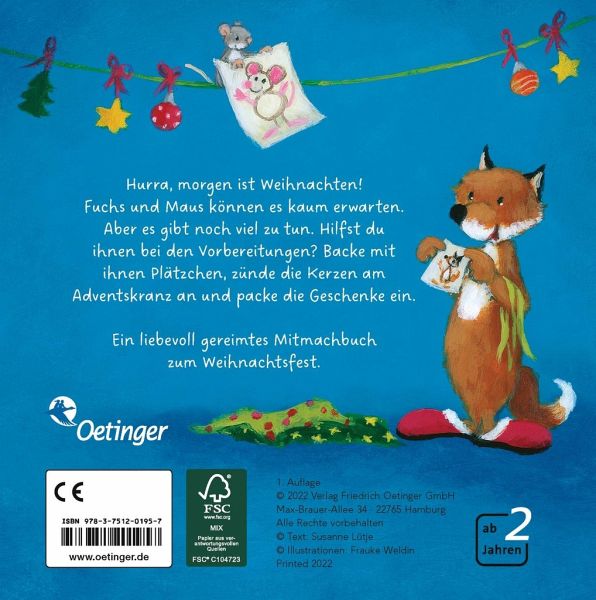 Interaktives Pappbilderbuch mit Reimen, das zum weihnachtlichen Mitmachspaß einlädt. Echte Weihnachtsstimmung durch zauberhafte Bilder von Frauke Weldin. Kinder ab 2 Jahren werden sanft zum Mitmachen animiert.