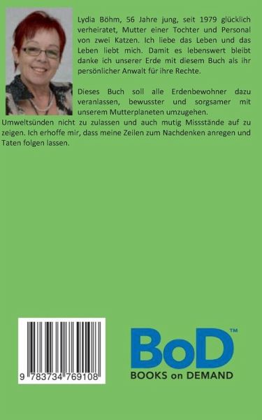 Dieses Buch soll alle Erdenbewohner dazu veranlassen bewusster und sorgsamer mit unserem Mutterplaneten umzugehen. Umweltsünden nicht zuzulassen und auch mutig Misstände aufzuzeigen. Ich erhoffe mir dass meine Zeilen zum Nachdenken anregen und Taten folgen lässt.