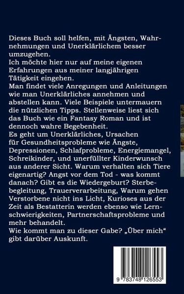 "Hilfe zur Selbsthilfe" ist der ausdrucksfähigste Titel für mein Lebenswerk."Sich den Wahrnehmungen stellen ist einfacher, als zu leiden".Man findet viele Anregungen und Anleitungen, wie man Unerklärliches annehmen und abstellen kann. Viele Beispiele untermauern die nützlichen Tipps.Stellenweise liest sich das Buch wie ein Fantasyroman und ist dennoch wahre Begebenheit.Es geht um Unerklärliches, Ursachen für Gesundheitsprobleme wie Ängste, Depressionen, Schlafprobleme, Energiemangel, Schreikinder, unerfüllter Kinderwunsch aus anderer Sicht. Warum verhalten sich Tiere eigenartig, Angst vor dem Tod - was kommt danach? Gibt es die Wiedergeburt? Sterbebegleitung, Trauerverarbeitung. Warum gehen Verstorbene nicht ins Licht, Kurioses aus der Zeit als Bestatterin werden ebenso wie Lernschwierigkeiten, Partnerschaftsprobleme behandelt. Wie kommt man zu dieser Gabe? "Über mich" gibt darüber Auskunft.