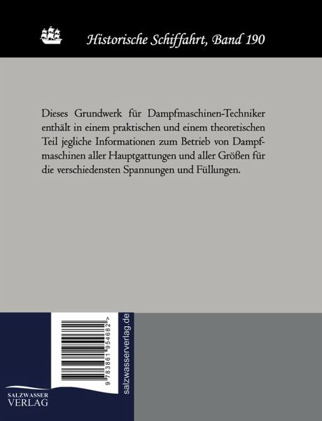 Dieses Grundwerk für Dampfmaschinen-Techniker enthält in einem praktischen und einem theoretischen Teil jegliche Informationen zum Betrieb von Dampfmaschinen aller Hauptgattungen und aller Größen für die verschiedensten Spannungen und Füllungen.