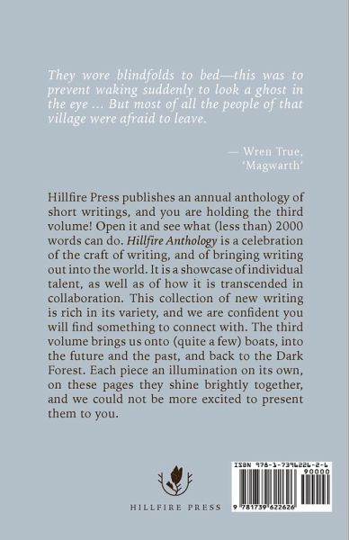 Hillfire Press publishes an annual anthology of short writings, and you are holding the third volume! Open it and see what (less than) 2000 words can do. Hillfire Anthology is a celebration of the craft of writing, and of bringing writing out into the world. It is a showcase of individual talent, as well as of how it is transcended in collaboration. This collection of new writing is rich in its variety, and we are confident you will find something to connect with. The third volume brings us onto (quite a few) boats, into the future and the past, and back to the dark forest. Each piece an illumination on its own, on these pages they shine brightly together, and we could not be more excited to present them to you. C O N T R I B U T I N G A U T H O R S Carly Craig Alexandra Ye E Mardot Hanna-Maria Vester Dorothy Lawrenson Malina Shamsudin David Blakeslee Nicole Christine Caratas Gerry Stewart Emerson Rose Craig Anthi Cheimariou Katie Hay-Molopo Miriam Huxley Thomas Carroll Skye Wilson M.H. Monica Tess Simpson Katharina Körber Megan Willis Abigail O'Neill Yang Yue Julia Guillermina Alex Penland Alyssa Osiecki Hayley Bernier Wren True