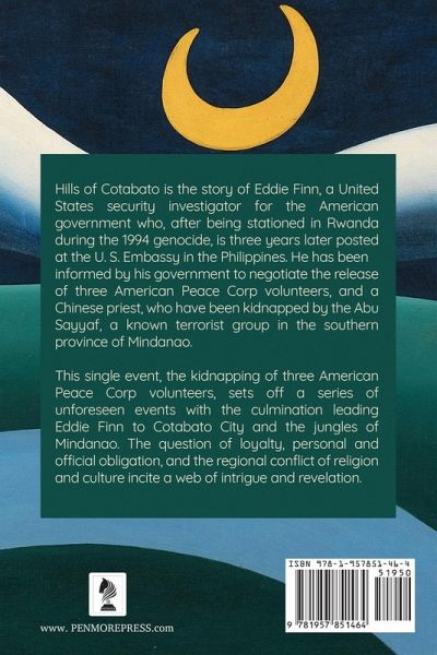Hills of Cotabato is the story of Eddie Finn, a United States security investigator for the American government who, after being stationed in Rwanda during the 1994 genocide, is three years later posted at the U. S. Embassy in the Philippines. He has been informed by his government to negotiate the release of three American Peace Corp volunteers, and a Chinese priest, who have been kidnapped by the Abu Sayyaf, a known terrorist group in the southern province of Mindanao. This single event, the kidnapping of three American Peace Corp volunteers, sets off a series of unforeseen events with the culmination leading Eddie Finn to Cotabato City and the jungles of Mindanao. The question of loyalty, personal and official obligation, and the regional conflict of religion and culture incite a web of intrigue and revelation.