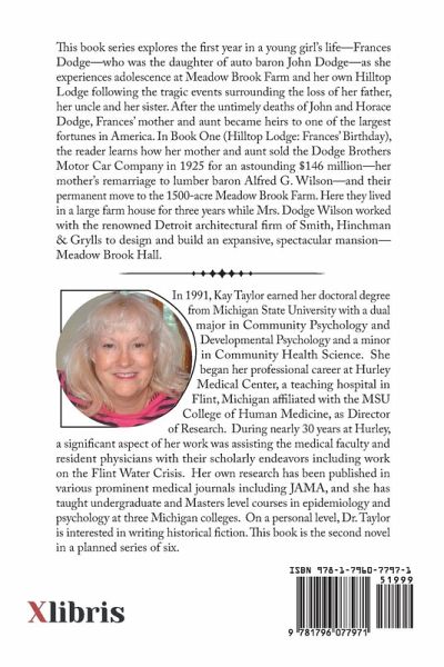 This book series explores the first year in a young girl's life-Frances Dodge-who was the daughter of auto baron John Dodge-as she experiences adolescence at Meadow Brook Farm and her own Hilltop Lodge following the tragic events surrounding the loss of her father, her uncle and her sister. After the untimely deaths of John and Horace Dodge, Frances' mother and aunt became heirs to one of the largest fortunes in America. In Book One (Hilltop Lodge: Frances' Birthday), the reader learns how her mother and aunt sold the Dodge Brothers Motor Car Company in 1925 for an astounding $146 million-her mother's remarriage to lumber baron Alfred G. Wilson-and their permanent move to the 1500-acre Meadow Brook Farm. Here they lived in a large farm house for three years while Mrs. Dodge Wilson worked with the renowned Detroit architectural firm of Smith, Hinchman & Grylls to design and build an expansive, spectacular mansion-Meadow Brook Hall.