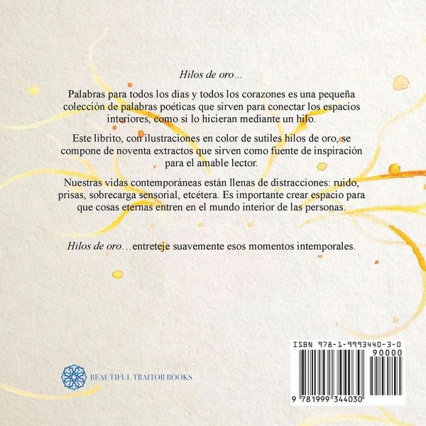'Hilos de oro' es una pequena coleccion de palabras poeticas que sirven para conectar los espacios interiores, como si lo hicieran mediante un hilo. Este librito, con ilustraciones en color de sutiles hilos de oro, se compone de noventa extractos que sirven como fuente de inspiracion para el amable lector.