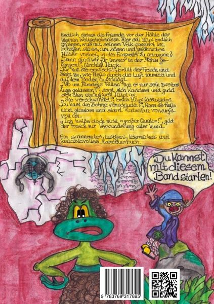 Vorlesebuch ab 6 Jahre Lesebuch ab 8 Jahre Eine Abenteuerreise von Deutschland (Bd 1-8) über Island (Bd 9 -14) nach Frankreich (Bd 15-23) Ein spannendes, lustiges, lehr- und fantasiereiches Abenteuerbuch. Worum geht es? Endlich stehen die Freunde vor der Höhle der kleinen Weltgeheimnisse. Hier soll Hilpi endlich erfahren, was mit seinem Volk passiert ist. Schaffen sie es, am bösen und gefährlichen Hüter vorbei, in die Eisgrotte zu gelangen? "Dann sind wir für immer in der Höhle gefangen!", fürchtet sich Hack. "Er hat sie erwischt!", brüllt der Frosch und sieht zu, wie Fleflo durch die Luft taumelt und auf dem Boden aufschlägt. "Wo um Himmels Willen hat er nur sein zweites Auge gelassen?", sorgt sich Karlchen und guckt sich den einäugigen Hilpi an. "Sie verschwindet!", brüllt Hilpi fassungslos. "Du hast die Bohne verschluckt?", kann es Fleflo nicht glauben und starrt Ratzebuz vorwurfsvoll an. "Ich heiße doch nicht Großer Quak!", gibt der Frosch zur Verwunderung aller kund. Du fragst dich, wer Hilpi ist? Ganz einfach: Der Knirps Hilpi ist mit seinen aufgerollten Schalenohren, den übergroßen Klamotten und der Kommodenknopfnase einzigartig und wohnt in einem Pantoffel. Hast du so etwas schon einmal gehört? Nun, ein solches Wesen hat es im Wetzlarer Wald noch nie gegeben. Er ist dort samt seinem Pantoffel aus dem Nichts aufgetaucht und wird vom Raben Ratzebuz gefunden. Die beiden beschließen nach Hilpis Verwandten zu suchen. Der Knilch besitzt einen Schrank voller kunterbunter Pantoffeln. Sie haben je nach Farbe merkwürdige Eigenschaften, von denen Hilpi keine Ahnung hat und die ihn ungewollt in gefährliche Situationen bringen. Doch Hilpi findet nach einem fast tödlichen Abenteuer neue Freunde. Den Draufgänger Hick, den Angsthasen Hack (beides Wasserläufer), den Stinkefliegerich Karlchen, den eigentlich griesgrämigen Ochsenfrosch großer Quak und die erzieherische Fledermaus Fleflo. Leider leidet der blitzgescheite Hilpi an einer sonderbaren Vergesslichkeit, die die Suche nach seinem Volk erschwert. Bald wird klar, dass es jemanden gibt, der Hilpi nach dem Leben trachtet... Während der Reise werden Orte wahrheitsgetreu beschrieben und der Leser lernt Vieles, ohne es zu merken. Ein Abenteuer- und Fantasiebuch in dem unvorhersehbare Situationen und Erkenntnisse immer neue Fragen aufwerfen, so dass der Leser unbedingt wissen will, wie es weitergeht. Unglaublich lustige Geschehnisse bringen den Leser zum Schmunzeln und Lachen.
