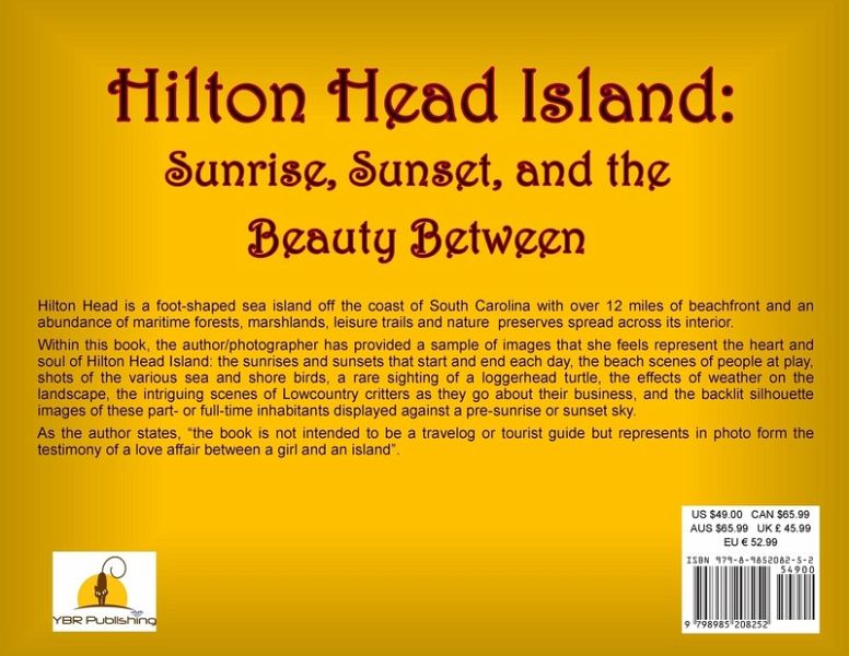 From an aerial viewpoint, Hilton Head is a foot-shaped, or ankle-boot shaped, island albeit without any visible toes. It lies roughly 95 miles south of Charleston and 31miles north of Savannah and is one of over 100 Sea islands on the Atlantic Ocean, along the coasts of South Carolina, Georgia and North Florida. The Sea islands form a chain of tidal and barrier islands along the coasts of South Carolina, Georgia and North Florida. It is sometimes referred to as a barrier island. A tidal island is a piece of land connected to the mainland by a natural or man-made causeway exposed at low tide and submerged at high tide. The terrain of a barrier island includes a dynamic beach system with offshore sandbars, a pounding surf and shifting beaches, as well as grassy dunes behind the beach, maritime forests with wetlands in the interiors, and salt or sand marshes facing the mainland. Using those defining characteristics, the north end of Hilton Head would be classified as a tidal island and the south end a barrier island. The barrier and tidal halves of Hilton Head Island are separated by Broad Creek, a land-locked tidal marsh. Hilton Head is roughly twelve miles long and 5 miles across at its widest point. It is surrounded by the Intra-Coastal Waterway on the mainland side and 13 miles of beachfront on the Atlantic. Those 13 miles include ten prominent beaches with public access (although some are tucked away inside gated communities with limited access). The beaches are what draw many visitors to the island. But those who deem to explore a little beyond the sandy shores are rewarded with at least 22 public parks and nature preserves, as well as, 64 miles of leisure trails (shared by foot traffic, bicycles, and the occasional Segway) spread across its 42 square miles of land. Hilton Head Island is also known for its rich history that dates back thousands of years to the seasonal occupation by Native Americans. The historical accounts of the island continue with its sighting by William Hilton in 1663, the arrival of English planters who grew indigo and rice, followed by the introduction of cotton after the American Revolution. Hilton Head became an important base of operations for the Union blockade of Southern ports during the Civil War. One of the things I most enjoy doing on the island is to pack up my camera and set out by foot, bicycle or car for a few hours of exploring along the beaches or inland areas. Those times have garnered me a large collection of photographs, some of which I have included in this book. This book is not intended to be a travelogue or tourist guide. I don't have photos of all of the various species of wildlife, or the top spots to visit. Instead, I consider this book the testimony of a love affair between a girl and an island, much like what I wrote about in books 3 and 4 of my Georgia Ayres novel series. In this case, I'm the girl, although I have long passed the age where that description could be used accurately! Within this book, I have tried to present a sample of what I find to be the heart and soul of Hilton Head Island: the sunrises and sunsets that start and end each day, and the various interior contributors to the total beauty and charm of the island. I hope you enjoy the visual journey!