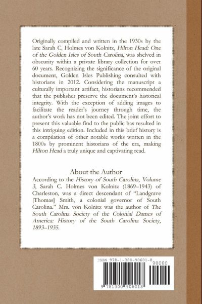 Originally compiled and written in the 1930s by the late Sarah C. Holmes von Kolnitz, Hilton Head: One of the Golden Isles of South Carolina, was shelved in obscurity within a private library collection for over 60 years. Recognizing the significance of the original document, Golden Isles Publishing consulted with historians in 2012. Considering the manuscript a culturally important artifact, historians recommended that the publisher preserve the document's historical integrity. With the exception of adding images to facilitate the reader's journey through time, the author's work has not been edited. The joint effort to present this valuable find to the public has resulted in this intriguing edition. Included in this brief history is a compilation of other notable works written in the 1800s by prominent historians of the era, making Hilton Head a truly unique and captivating read.