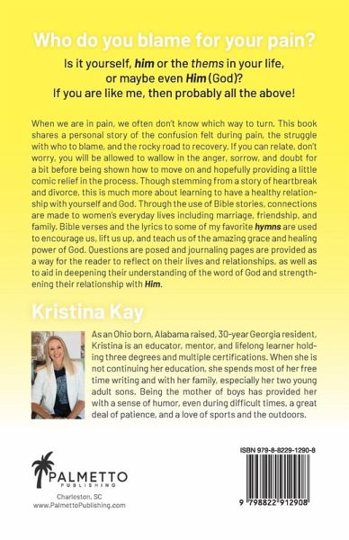 Who do you blame for your pain? Is it yourself, him or the thems in your life, or maybe even Him (God)? If you are like me, then probably all the above! When we are in pain, we often don't know which way to turn. This book shares a personal story of the confusion felt during pain, the struggle with who to blame, and the rocky road to recovery. If you can relate, don't worry, you will be allowed to wallow in the anger, sorrow, and doubt for a bit before being shown how to move on and hopefully providing a little comic relief in the process. Though stemming from a story of heartbreak and divorce, this is much more about learning to have a healthy relationship with yourself and God. Through the use of Bible stories, connections are made to women's everyday lives including marriage, friendship, and family. Bible verses and the lyrics to some of my favorite hymns are used to encourage us, lift us up, and teach us of the amazing grace and healing power of God. Questions are posed and journaling pages are provided as a way for the reader to reflect on their lives and relationships, as well as to aid in deepening their understanding of the word of God and strengthening their relationship with Him.