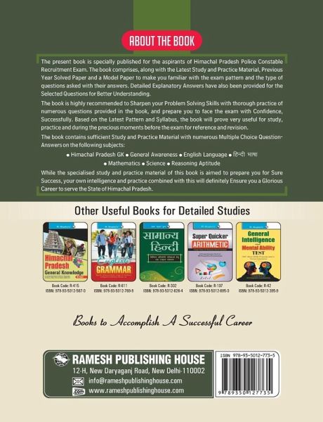 This comprehensive book is specially developed for the candidates of Himachal Pradesh police: Constable Recruitment examination. This book includes Model Paper (Solved), previous Paper (Solved) & Study material for the purpose of practice of questions based on the latest pattern of the examination. Detailed Explanatory Answers have also been provided for the selected questions for Better understanding of the Candidates. This comprehensive book is specially developed for the candidates of Himachal Pradesh police: Constable Recruitment examination. This book includes Model Paper (Solved), previous Paper (Solved) & Study material for the purpose of practice of questions based on the latest pattern of the examination. Detailed Explanatory Answers have also been provided for the selected questions for Better understanding of the Candidates.
