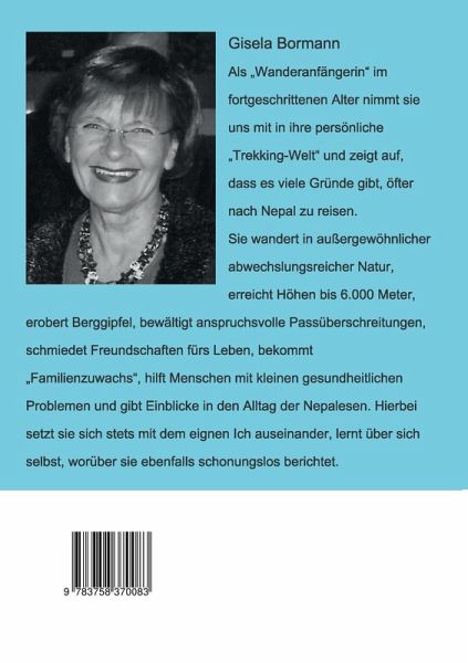 Bei zehn Trekking-Touren in Nepal lässt Gisela Bormann uns teilhaben an Ihren Erfolgen mit großen Glücksmomenten, sowie Scheitern gesetzter Ziele, die trotzdem immer für sie mit positiven Ergebnis enden Sie berichtet von der gigantischen Bergkulisse im Himalaya und lässt dabei die Ehrfurcht vor unserer wunderbaren Natur nie außer Acht. Sie beschäftigt sich mit Menschen, hilft wo sie kann und lernt dabei, wie man mit kleinen Taten große Dinge bewegen kann.