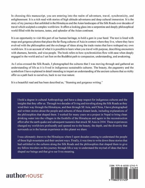 In choosing this manuscript, you are entering into the realm of adventure, travel, synchronicity, and enlightenment. It is a rich read with stories of high altitude adventures and deep cultural immersion. It is the story of my journeys that unfolded in the Himalayas and the Asian landscapes of the Silk Roads over decades of travel which sculpted a complex worldview. It offers a looking glass into a serpentine and deeply philosophical world filled with the textures, tastes, and splendor of the Asian continent. It is an opportunity to visit this part of our human heritage, to hold a gem in your hand. The text is lined with maps and gorgeous photos that place the far flung cultures of Asia in context where they live, where they have evolved with the philosophies and the exchange of ideas along the trade routes that have reshaped my own worldview. It is an account of what it is possible to learn when you travel with purpose, describing encounters with shamans, hermits, and wise people. The book refers to how synchronicities flow with ease when deeply engaged in the world and as I set foot on the Buddhist path to compassion, understanding, and awakening. As I criss-crossed the Silk Roads, I photographed the cultures that I was moving through and gathered an understanding of life as it is lived in indigenous sustainable cultures. The beauty, the pageantry and the symbolism I have explained in detail intending to impart an understanding of the ancient cultures that so richly offer us a path back to ourselves, back to our true nature. It is a beautiful read and has been described as, "Stunning and gorgeous writing."