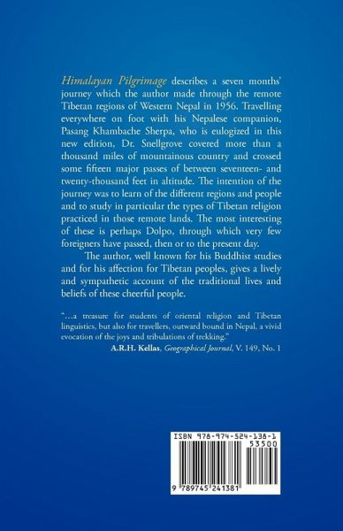 Himalayan Pilgrimage describes a seven months' journey which the author made through the remote Tibetan regions of Western Nepal in 1956. Travelling everywhere on foot with his Nepalese companion, Pasang Khambache Sherpa, who is eulogized in this new edition, Dr. Snellgrove covered more than a thousand miles of mountainous country and crossed some fifteen major passes of between seventeen- and twenty-thousand feet in altitude. The intention of the journey was to learn of the different regions and people and to study in particular the types of Tibetan religion practiced in those remote lands. The most interesting of these is perhaps Dolpo, through which very few foreigners have passed, then or to the present day. The author, well known for his Buddhist studies and for his affection for Tibetan peoples, gives a lively and sympathetic account of the traditional lives and beliefs of these cheerful people.