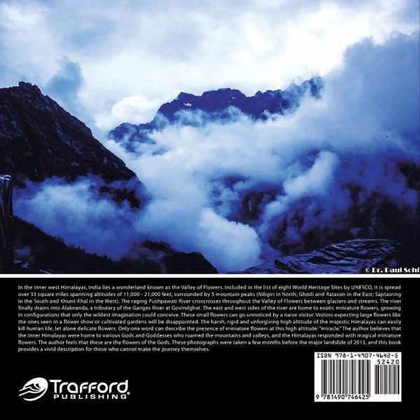 In the inner west Himalayas, India lies a wonderland known as the Valley of Flowers. Included in the list of eight World Heritage Sites by UNESCO, it is spread over 33 square miles spanning altitudes of 11,000 - 21,000 feet, surrounded by 5 mountain peaks (Niligiri in North; Ghodi and Ratavan in the East; Saptasring in the South and Khunt-Khal in the West). The raging Pushpawati River crisscrosses throughout the Valley of Flowers between glaciers and streams. The river finally drains into Alaknanda, a tributary of the Ganges River at Govindghat. The east and west sides of the river are home to exotic miniature flowers, growing in configurations that only the wildest imagination could conceive. These small flowers can go unnoticed by a naive visitor. Visitors expecting large flowers like the ones seen in a flower show or cultivated gardens will be disappointed. The harsh, rigid and unforgiving high altitude of the majestic Himalayas can easily kill human life, let alone delicate flowers. Only one word can describe the presence of miniature flowers at this high altitude: "miracle." The author believes that the inner Himalayas were home to various Gods and Goddesses who roamed the mountains and valleys, and the Himalayas responded with magical miniature flowers. The author feels that these are the flowers of the Gods. These photographs were taken a few months before the major landslide of 2013, and this book provides a vivid description for those who cannot make the journey themselves.