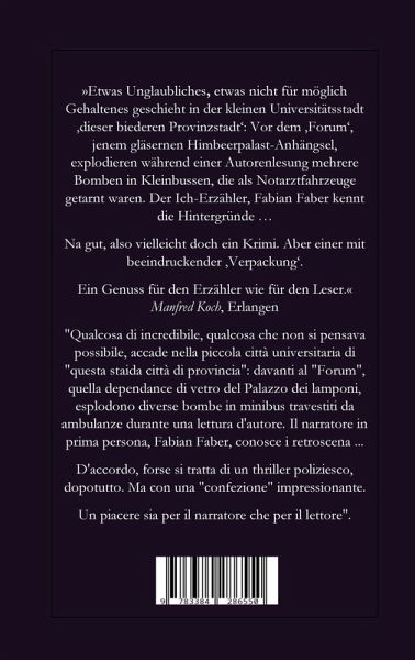 »Etwas Unglaubliches, etwas nicht für möglich Gehaltenes geschieht in der kleinen Universitätsstadt 'dieser biederen Provinzstadt': Vor dem 'Forum', jenem gläsernen Himbeerpalast-Anhängsel, explodieren während einer Autorenlesung mehrere Bomben in Kleinbussen, die als Notarztfahrzeuge getarnt waren. Der Ich-Erzähler, Fabian Faber kennt die Hintergründe ...Na gut, also vielleicht doch ein Krimi. Aber einer mit beeindruckender 'Verpackung'.Ein Genus für den Erzähler wie für den Leser.« Manfred Koch, Erlangen "Qualcosa di incredibile, qualcosa che non si pensava possibile, accade nella piccola città universitaria di "questa staida città di provincia": davanti al "Forum", quella dependance di vetro del Palazzo dei lamponi, esplodono diverse bombe in minibus travestiti da ambulanze durante una lettura d'autore. Il narratore in prima persona, Fabian Faber, conosce i retroscena ...D'accordo, forse si tratta di un thriller poliziesco, dopotutto. Ma con una "confezione" impressionanteUn piacere sia per il narratore che per il lettore".