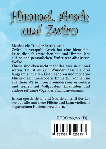 In dieser Sammlung an durchgeknallten Geschichten und Gedichten werden Flüche lebendig und lassen die Menschen spüren, wie es ist, eine Antwort zu erhalten. Doch kämpfen viele der unflätigen Schimpfwörter inzwischen ums nackte Überlegen, da der Wortschatz verkümmert und meistens nur noch reichlich einsilbig geflucht wird.Himmel, Arsch und Zwirn sind daher auf der Suche nach Orten, an denen man ihre Fluchqualitäten noch zu schätzen weiß. Sie besuchen das Finanzamt, den Bahnhof und schaffen es sogar, trotz zahlreicher Verspätungen einen Zug zu erwischen. Sie treffen auf ihrer Reise auf alte und neue Freunde wie Drecksack, Vollpfosten und unleidige Verwandte.