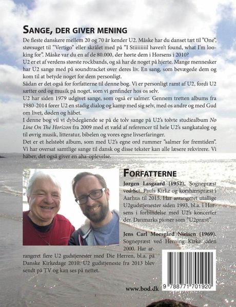 Sange, der giver mening. U2 er et af verdens største rockbands og så har de noget på hjerte. Mange mennesker har U2 sange med på soundtracket over deres liv. En sang, som bevægede dem, og kom til at betyde noget for dem personligt. Sådan er det også for forfatterne til denne bog. Vi er personligt ramt af U2, fordi U2 sætter ord og musik på tro, håb, kærlighed, længsel, vrede, frustration og selverkendelse, som vi genfinder hos os selv. Hos U2 kan man finde "a song that makes some sense out of the world" (frit citeret fra "The Miracle (of Joey Ramone)" fra U2s album fra 2014 Songs of Innocence). U2 har siden 1979 udgivet sange, som også er salmer. Gennem 13 albums fra 1980 - 2014 fører U2 en stadig dialog og kamp med sig selv, med os andre og med Gud om livet, døden og håbet. I denne bog vil vi dybdegående se på de tolv sange på U2s tolvte studiealbum "No Line On The Horizon" fra 2009 med et væld af referencer til hele U2s sangkatalog og til øvrig musik, litteratur, bibelen og vores egne livserfaringer. Det er et helstøbt album, som med U2¿s egne ord rummer "salmer for fremtiden". Vi har oversat samtlige sange til dansk og disse tekster kan alle læsere rekvirere. Vi håber det også giver en aha-oplevelse. "No Line On The Horizon" kredser om nærhed og afstand til Gud. Spændet mellem nærhed, håb og glæde overfor afstand, sorg og frustration. Det tema vækker genklang i vores egne liv. Slår man lejr i himlen, bliver man verdensfjern og halleluja-frelst. Slår man lejr i gudsforladtheden, bliver man menneskefjendsk og depressiv. U2 formulerer den spænding, som livet udfolder sig i, og som vi som præster forkynder, at Guds kærlighed virker.