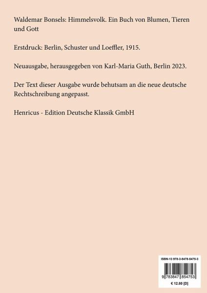 Waldemar Bonsels: Himmelsvolk. Ein Buch von Blumen, Tieren und GottLesefreundlicher Großdruck in 16-pt-SchriftGroßformat, 210 x 297 mmBerliner Ausgabe, 2023Durchgesehener Neusatz bearbeitet und eingerichtet von Theodor BorkenErstdruck: Berlin, Schuster und Loeffler, 1915.Inhaltsverzeichnis:Himmelsvolk. Ein Buch von Blumen, Tieren und Gott.1. Die Waldwiese.2. Die Ankunft des Elfen.3. Die Frühlingsnacht.4. Wiesenleute.5. Der Tod der Eiche.6. Von den Engeln.7. Hassans Kampf mit Ala.8. Die Winde.9. Die Lerche.10. Assap und Jen.11. Ukus Nacht mit dem Elfen.12. Traule.13. Der Maikäfer.14. Das sterbende Kind.15. Der Fuchs.16. Die Elfennacht.17. Das Reich.18. Der Abschied.Der Text dieser Ausgabe wurde behutsam an die neue deutsche Rechtschreibung angepasst.Umschlagabbildung: Warwick Goble, bearbeiteter Ausschnitt einer Kinderbuchillustration, 1920Gesetzt aus der Minion Pro, 16 pt.Henricus - Edition Deutsche Klassik GmbH