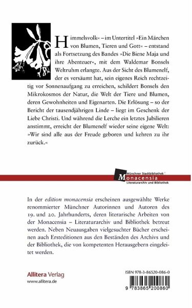 Himmelsvolk" - im Untertitel "Ein Märchen von Blumen, Tieren und Gott" - entstand als Fortsetzung des Bandes "Die Biene Maja und ihre Abenteuer", mit dem Waldemar Bonsels Weltruhm erlangte. Aus der Sicht des Blumenelf, der es versäumt hat, sein eigenes Reich rechtzeitig vor Sonnenaufgang zu erreichen, schildert Bonsels den Mikrokosmos der Natur, die Welt der Tiere und Blumen, deren Gewohnheiten und Eigenarten. Die Erlösung - so der Bericht der tausendjährigen Linde - liegt im Geschenk der Liebe Christi. Und während die Lerche ein letztes Jubilieren anstimmt, erreicht der Blumenelf wieder seine eigene Welt: "Wir sind alle aus der Freude geboren und kehren zu ihr zurück."