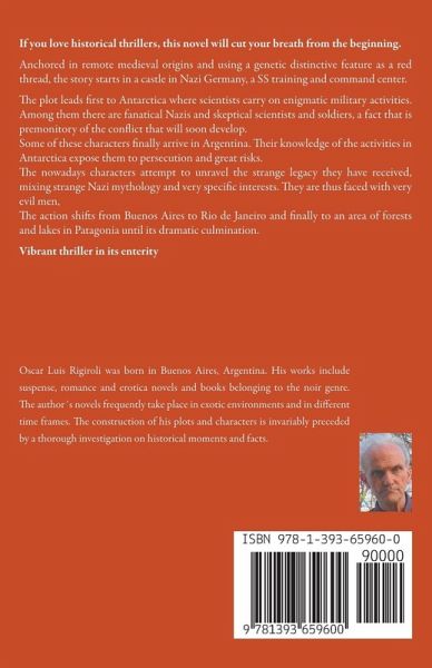 If you love historical thrillers, this novel will cut your breath from the beginning. Anchored in remote medieval origins and using a genetic distinctive feature as a red thread, the story starts in a castle in Nazi Germany, a SS training and command center. The plot leads first to Antarctica where scientists carry on enigmatic military activities. Among them there are fanatical Nazis and skeptical scientists and soldiers, a fact that is premonitory of the conflict that will soon develop. Some of these characters finally arrive in Argentina. Their knowledge of the activities in Antarctica expose them to persecution and great risks. The nowadays characters attempt to unravel the strange legacy they have received, mixing strange Nazi mythology and very specific interests. They are thus faced with very evil men, The action shifts from Buenos Aires to Rio de Janeiro and finally to an area of forests and lakes in Patagonia until its dramatic culmination. Vibrant thriller in its enterity