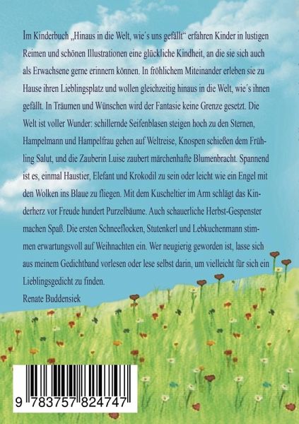 Im Kinderbuch "Hinaus in die Welt, wie es uns gefällt" erfahren Kinder in lustigen Reimen und schönen Illustrationen eine glückliche Kindheit, an die sie sich auch als Erwachsene gerne erinnern können. In fröhlichem Miteinander erleben sie zu Hause ihren Lieblingsplatz und wollen gleichzeitig hinaus in die Welt, wie es ihnen gefällt. In Träumen und Wünschen wird der Fantasie keine Grenze gesetzt. Die Welt ist voller Wunder: schillernde Seifenblasen steigen bis zu den Sternen, Hampelmann und Hampelfrau gehen auf Weltreise, Knospen schießen dem Frühling Salut, und die Zauberin Luise zaubert märchenhafte Blumenpracht. Spannend ist es, einmal Haustier, Elefant und Krokodil zu sein oder leicht wie ein Engel mit den Wolken ins Blaue zu fliegen. Mit dem Kuscheltier im Arm schlägt das Kinderherz vor Freude hundert Purzelbäume. Auch schauerliche Herbst-Gespenster machen Spaß. Die ersten Schneeflocken, Stutenkerl und Lebkuchenmann stimmen erwartungsvoll auf Weihnachten ein. Wer neugierig geworden ist, lasse sich aus meinem Gedichtband vorlesen oder lese selbst darin, um vielleicht für sich ein Lieblingsgedicht zu finden.