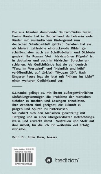 Die aus Istanbul stammende Deutsch-Türkin Suzan Emine Kaube hat als Lehrerin viele Kindern mit ausländischem Hintergrund zum Abschluß an einer deutschen Schule geführt. Daneben hat sie als Malerin zahlreiche eindrucksvolle Bilder geschaffen, aber auch als Schriftstellerin und Dichterin gewirkt. Ihr Roman "Auf türkisgrünen Flügeln" ist sowohl in deutscher wie auch in türkischer Sprache veröffentlicht. Als Gedichtbände sind auf deutsch "Tanz im Westwind" und "Heimlich und kühl" erschienen, auf türkisch "Uyuyan Göl". Nach längerer Pause legt sie jetzt mit "Hinaus ins Licht" einen weiteren Gedichtband vor.