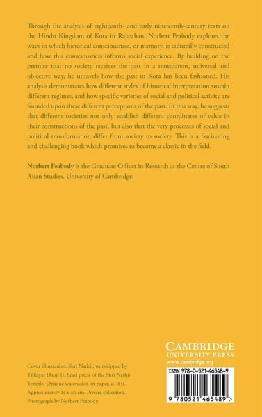 Through the analysis of eighteenth- and early nineteenth-century texts on the Hindu Kingdom of Kota in Rajasthan, in this 2003 book Norbert Peabody explores the ways in which historical consciousness, or memory, is culturally constructed and how this consciousness informs social experience. By building on the premise that no society receives the past in a transparent, universal and objective way, he unravels how the past in Kota has been fashioned. His analysis demonstrates how different styles of historical interpretation sustain different regimes, and how specific varieties of social and political activity are founded upon these different perceptions of the past. In this way, he suggests that different societies not only establish different co-ordinates of value in their constructions of the past, but also that the very processes of social and political transformation differ from society to society. This is a fascinating and challenging book which promises to become a classic in the field.