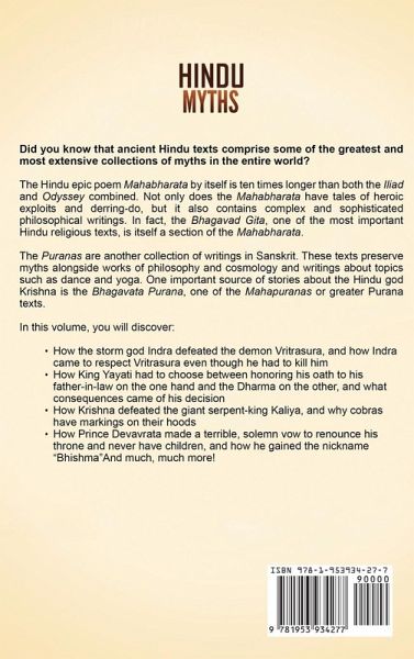 Did you know that ancient Hindu texts comprise some of the greatest and most extensive collections of myths in the entire world? The Hindu epic poem Mahabharata by itself is ten times longer than both the Iliad and Odyssey combined. Not only does the Mahabharata have tales of heroic exploits and derring-do, but it also contains complex and sophisticated philosophical writings. In fact, the Bhagavad Gita, one of the most important Hindu religious texts, is itself a section of the Mahabharata. The Puranas are another collection of writings in Sanskrit. These texts preserve myths alongside works of philosophy and cosmology and writings about topics such as dance and yoga. One important source of stories about the Hindu god Krishna is the Bhagavata Purana, one of the Mahapuranas or greater Purana texts. Tales from the Mahabharata and Bhagavata Purana make for lively reading. However, more than that, they also give us a window into important Hindu ideas about Dharma, a complex concept that involves law, custom, and both social and cosmic order, as well as philosophies of good and evil. In some of these stories, we learn that what we might think of as evil might not be quite as bad as we think and that even supposedly evil beings can have rich inner lives and sophisticated thoughts about the meaning of life and the places these beings have in the universe. In this volume, you will discover:How the storm god Indra defeated the demon Vritrasura, and how Indra came to respect Vritrasura even though he had to kill him How King Yayati had to choose between honoring his oath to his father-in-law on the one hand and the Dharma on the other, and what consequences came of his decision How Krishna defeated the giant serpent-king Kaliya, and why cobras have markings on their hoods How Prince Devavrata made a terrible, solemn vow to renounce his throne and never have children, and how he gained the nickname "Bhishma" How Bhishma's rash actions in kidnapping brides for his brothers led to misery for one of the women he took, and how she waited through two lifetimes to get her revenge How Krishna and the hero Arjuna helped the fire god Agni consume the Khandava Forest, and how that act led to the feud between the Kauravas and Pandavas that is at the heart of the Mahabharata How the hero Bhima met the monkey-god Hanuman while he was on a mission to get flowers for his wife And much, much more! Scroll up and click the "add to cart" button to read these captivating Hindu myths!