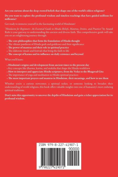 Are you curious about the deep-rooted beliefs that shape one of the world's oldest religions? Do you want to explore the profound wisdom and timeless teachings that have guided millions for millennia? Get ready to immerse yourself in the fascinating world of Hinduism! "Hinduism for Beginners: An Essential Guide to Hindu Beliefs, Mantras, Deities, and Practices" by Anand Rishi is your gateway to understanding this ancient and diverse faith. This comprehensive guide will take you on an enlightening journey through:The core philosophies that form the foundation of Hindu thought The vibrant pantheon of Hindu gods and goddesses and their significance The power of mantras and their role in spiritual practice The elaborate rituals and festivals that bring the faith to life The concept of karma and its influence on daily existence and beyond What you'll learn:Hinduism's origins and development from ancient times to the present day Key concepts like dharma, karma, and moksha that shape the Hindu worldview How to interpret and appreciate Hindu scriptures, from the Vedas to the Bhagavad Gita The importance of yoga and meditation in Hindu spiritual practices The most important prayers and mantras in Hinduism, their meanings, and how to use them Whether you're a curious newcomer, a spiritual seeker, or someone looking to broaden their understanding of world religions, this book offers valuable insights into one of humanity's most enduring spiritual traditions. Don't miss this opportunity to uncover the depths of Hinduism and gain a richer appreciation for its profound wisdom. Get your copy of "Hinduism for Beginners" today and start your journey into the captivating realm of Hindu philosophy, spirituality, and culture!