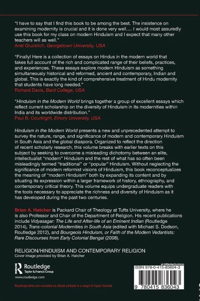 List of maps and illustrations. Notes on contributors. Introduction Brian Hatcher. Part I: Hinduism Today: Three Perspectives. 1. Hinduism in South India Leela Prasad. 2. Hinduism in North India Brian Pennington. 3. Transnational movements Hanna Kim. Part II: The Colonial Backdrop. 4. Debates within Colonial Hinduism Amiya P. Sen. 5. Colonial devotional paths Jason Fuller. 6. Hinduism and colonial law Donald Davis and Timothy Lubin. Part III: Movements and Relocations. 7. Hinduism in Fiji, Africa and Trinidad Anantanand Rambachan and Usha Shukla. 8. Hinduism in Britain Maya Warrier. 9. Hinduism in the United States Prema Kurien. Part IV: Networks of Meaning 10. Modern Monks and Global Hinduism Tim Dobe. 11. Modern Yoga and Tantra Lola Williamson. 12. Renunciation and domesticity Meena Khandelwal. 13. Modern Vedic ritual Frederick M. Smith. 14. Visual and Media Culture Karline McLain. Part V: Critical Social and Political Issues. 15. Public Hinduism and Hindutva Pralay Kanungo. 16. Caste and untouchability Rupa Viswanath. 17. Gender and Sexuality Ruth Vanita. 18. Ecology and the environment Eliza Kent. Conclusion Brian Hatcher. Glossary. Index.