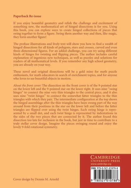 Using this book, you can explore ways to create hinged collections of pieces that swing together to form a figure. Swing them another way and they form another figure! The profuse illustrations and lively text will show you how to find a wealth of hinged dissections for all kinds of polygons, stars and crosses, curved and even three-dimensional figures. For an added challenge, you can try using different kinds of hinges for twisting and flipping pieces. The author includes careful explanation of ingenious techniques, as well as puzzles and solutions for readers of all mathematical levels. If you remember any secondary school geometry, you are already on your way. These novel and original dissections will be a gold mine for math puzzle enthusiasts, for math educators in search of enrichment topics, and for anyone who loves to see beautiful objects in motion.