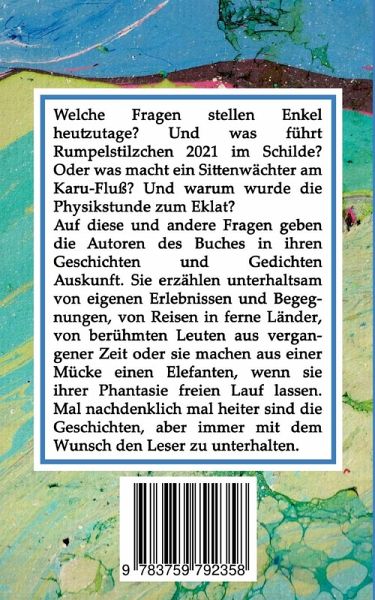Welche Fragen stellen Enkel heutzutage? Und was führt Rumpelstilzchen 2021 im Schilde? Oder was macht ein Sittenwächter am Karu-Fluß? Und warum wurde die Physikstunde zum Eklat? Auf diese und andere Fragen geben die Autoren des Buches in ihren Geschichten und Gedichten Auskunft. Sie erzählen unterhaltsam von eigenen Erlebnissen und Begegnungen, von Reisen in ferne Länder, von berühmten Leuten aus vergangener Zeit oder sie machen aus einer Mücke einen Elefanten, wenn sie ihrer Fantasie freien Lauf lassen. Mal nachdenklich mal heiter sind die Geschichten, aber immer mit dem Wunsch den Leser zu unterhalten.