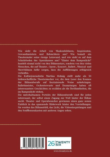 Wie sieht die Arbeit von Maskenbildnern, Inspizienten, Gewandmeistern und Beleuchtern aus? Wie bemalt ein Theatermaler seine riesige Leinwand, und was passiert auf dem Schnürboden des Opernhauses? "Hinter dem Rampenlicht" handelt einmal nicht von den Bühnenstars, sondern von den vielen Menschen, die auf Theater-, Opern-, Konzert-, Ballett-, Musical- und Showbühnen dafür sorgen, dass die Aufführungen erfolgreich verlaufen.Die Kulturjournalistin Martina Helmig stellt mehr als 50 leidenschaftliche Theatermacher vor, die dem Leser den Kosmos der Bühnenberufe auf faszinierende Weise nahebringen. Ballettmeister, Orchesterwarte und Dramaturgen haben oft interessantere Geschichten zu erzählen als die Berühmtheiten, die im Rampenlicht stehen. Die unterhaltsamen Porträts der Bühnenberufe sind für jeden interessant, der selbst einen Zugang zur Welt hinter der Bühne sucht. Theater- und Opernbesucher gewinnen einen ganz neuen Einblick in das spannende Räderwerk hinter den Vorstellungen. Sie werden das Bühnenbild, das Licht, die Videoeinspielungen und den Souffleusenkasten mit anderen Augen sehen.