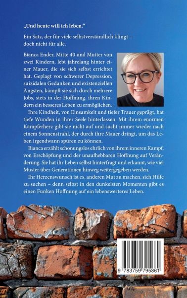 "Und heute will ich leben." Ein Satz, der für viele selbstverständlich klingt - doch nicht für alle. Bianca Ender, Mitte 40 und Mutter von zwei Kindern, lebt jahrelang hinter einer Mauer, die sie sich selbst errichtet hat. Geplagt von schwerer Depression, suizidalen Gedanken und existenziellen Ängsten, kämpft sie sich durch mehrere Jobs, stets in der Hoffnung, ihren Kindern ein besseres Leben zu ermöglichen. Ihre Kindheit, von Einsamkeit und tiefer Trauer geprägt, hat tiefe Wunden in ihrer Seele hinterlassen. Mit ihrem enormen Kämpferherz gibt sie nicht auf und sucht immer wieder nach einem Sonnenstrahl, der durch ihre Mauer dringt, um das Leben irgendwann spüren zu können. Bianca erzählt schonungslos ehrlich von ihrem inneren Kampf, von Erschöpfung und der unaufhebbaren Hoffnung auf Veränderung. Sie hat ihr Leben selbst hinterfragt und erkannt, wie viel Muster über Generationen hinweg weitergegeben werden. Ihr Herzenswunsch ist es, anderen Mut zu machen, sich Hilfe zu suchen - denn selbst in den dunkelsten Momenten gibt es einen Funken Hoffnung auf ein lebenswerteres Leben.