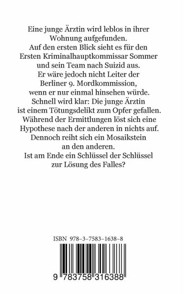 Eine junge Ärztin wird leblos in ihrer Wohnung aufgefunden. Auf den ersten Blick sieht es für den Ersten Kriminalhauptkommissar Sommer und sein Team nach Suizid aus. Er wäre jedoch nicht Leiter der Berliner 9. Mordkommission, wenn er nur einmal hinsehen würde. Schnell wird klar: Die junge Ärztin ist einem Tötungsdelikt zum Opfer gefallen. Während der Ermittlungen löst sich eine Hypothese nach der anderen in nichts auf. Dennoch reiht sich ein Mosaikstein an den anderen. Ist am Ende ein Schlüssel der Schlüssel zur Lösung des Falles?