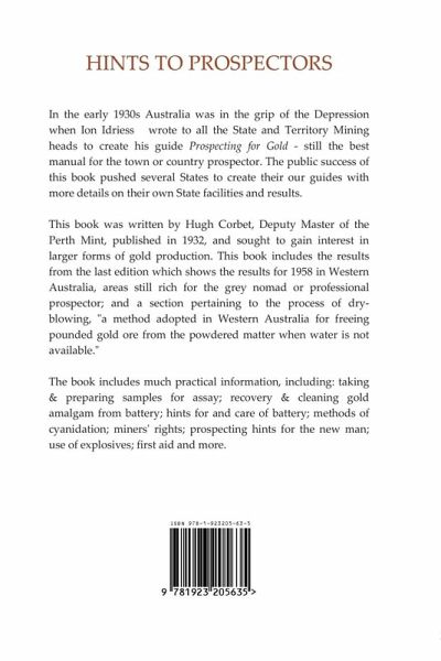 In the early 1930s Australia was in the grip of the Depression when Ion Idriess wrote to all the State and Territory Mining heads to create his guide Prospecting for Gold - still the best manual for the town or country prospector. The public success of this book pushed several States to create their our guides with more details on their own State facilities and results. This book was written by Hugh Corbet, Deputy Master of the Perth Mint, published in 1932, and sought to gain interest in larger forms of gold production. This book includes the results from the last edition which shows the results for 1958 in Western Australia, areas still rich for the grey nomad or professional prospector; and a section pertaining to the process of dryblowing, "a method adopted in Western Australia for freeing pounded gold ore from the powdered matter when water is not available." The book includes much practical information, including: taking & preparing samples for assay; recovery & cleaning gold amalgam from battery; hints for and care of battery; methods of cyanidation; miners' rights; prospecting hints for the new man; use of explosives; first aid and more.