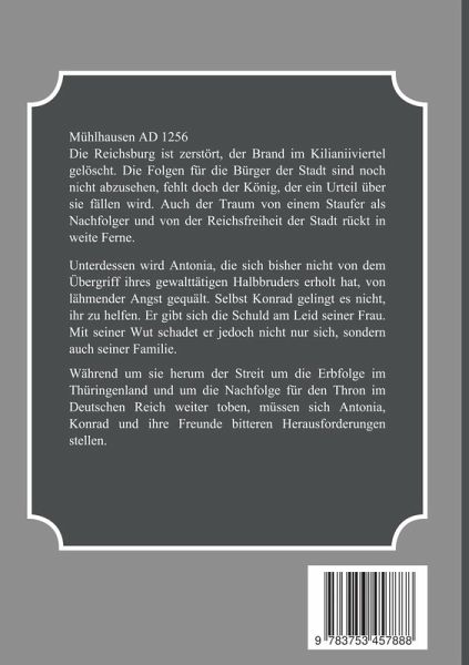 Mühlhausen AD 1256Die Reichsburg ist zerstört, der Brand im Kilianiiviertel gelöscht. Die Folgen für die Bürger der Stadt sind noch nicht abzusehen, fehlt doch der König, der ein Urteil über sie fällen wird. Der Traum von einem Staufer als Nachfolger und von der Reichsfreiheit der Stadt rückt in weite Ferne.Unterdessen wird Antonia, die sich bisher nicht von dem Übergriff ihres gewalttätigen Halbbruders erholt hat, von lähmender Angst gequält. Selbst Konrad gelingt es nicht, ihr zu helfen. Er gibt sich die Schuld am Leid seiner Frau. Mit seiner Wut schadet er jedoch nicht nur sich, sondern auch seiner Familie.Während um sie herum der Streit um die Erbfolge im Thüringenland und um die Nachfolge für den Thron im Deutschen Reich weiter toben, müssen sich Antonia, Konrad und ihre Freunde bitteren Herausforderungen stellen.