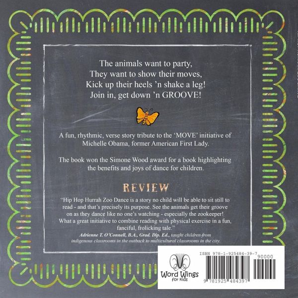 The animals want to party, They want to show their moves, Kick up their heels 'n shake a leg! Join in, get down 'n GROOVE! A fun, rhythmic, verse story tribute to the MOVE initiative of Michelle Obama, America's African-American First Lady, encouraging children to get up and "MOVE" and have fun doing it! The book won the Simone Wood Award for a book highlighting the benefits and joys of dance to children. www.wordwings.wix.com/publishing www.jenniferrpoulter.weebly.com http://jadepottsinc.com/ www.takarabeech.com/hip-hop-hurrah-zoo-dance Author: J.R. Poulter Illustrator: Jade Potts Illustration & design Takara Beech