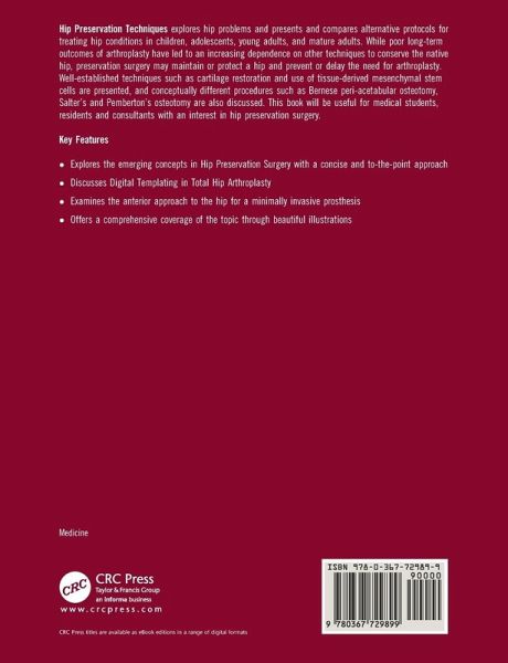 Hip Preservation Techniques explores hip problems and presents and compares alternative protocols for treating the condition in children, adolescents, young adults, and adults. While poor long-term outcomes of arthroplasty have led to an increasing dependence on procedures to conserve the native hip, preservation surgery may maintain or protect a hip and prevent or delay the need for arthroplasty. Well-established techniques such as cartilage restoration and use of tissue-derived mesenchymal stem cells are presented, and conceptually different procedures such as Bernese peri-acetabular osteotomy, Salter's and Pemberton's osteotomy are also discussed. This book will be useful for medical students, residents and consultants with an interest in hip preservation surgery. Key Features Explores the emerging concepts in hip preservation surgery with a concise and to-the-point approach Discusses digital templating in total hip arthroplasty Examines the anterior approach to the hip for a minimally invasive prosthesis Offers a comprehensive coverage of the topic through beautiful illustrations