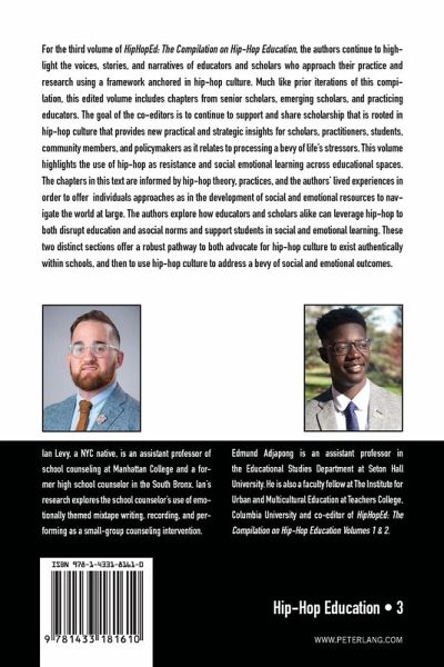 For the third volume of HipHopEd: The Compilation on Hip-Hop Education, the authors continue to highlight the voices, stories, and narratives of educators and scholars who approach their practice and research using a framework anchored in hip-hop culture. Much like prior iterations of this compilation, this edited volume includes chapters from senior scholars, emerging scholars, and practicing educators. The goal of the co-editors is to continue to support and share scholarship that is rooted in hip-hop culture that provides new practical and strategic insights for scholars, practitioners, students, community members, and policymakers as it relates to processing a bevy of life's stressors. This volume highlights the use of hip-hop as resistance and social emotional learning across educational spaces. The chapters in this text are informed by hip-hop theory, practices, and the authors' lived experiences in order to offer individuals approaches as in the development of social and emotional resources to navigate the world at large. The authors explore how educators and scholars alike can leverage hip-hop to both disrupt education and asocial norms and support students in social and emotional learning. These two distinct sections offer a robust pathway to both advocate for hip-hop culture to exist authentically within schools, and then to use hip-hop culture to address a bevy of social and emotional outcomes.