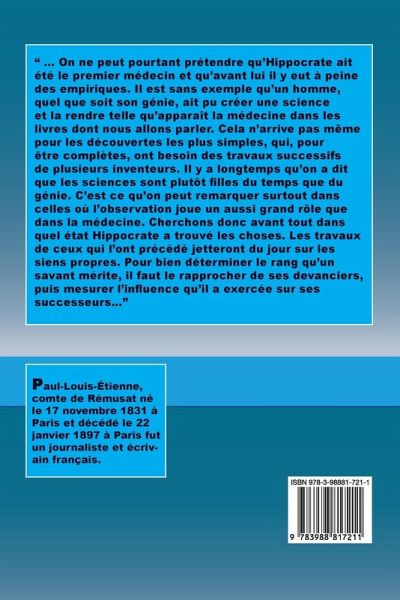 " ... On ne peut pourtant prétendre qu'Hippocrate ait été le premier médecin et qu'avant lui il y eut à peine des empiriques. Il est sans exemple qu'un homme, quel que soit son génie, ait pu créer une science et la rendre telle qu'apparaît la médecine dans les livres dont nous allons parler. Cela n'arrive pas même pour les découvertes les plus simples, qui, pour être complètes, ont besoin des travaux successifs de plusieurs inventeurs. Il y a longtemps qu'on a dit que les sciences sont plutôt filles du temps que du génie. C'est ce qu'on peut remarquer surtout dans celles où l'observation joue un aussi grand rôle que dans la médecine. Cherchons donc avant tout dans quel état Hippocrate a trouvé les choses. Les travaux de ceux qui l'ont précédé jetteront du jour sur les siens propres. Pour bien déterminer le rang qu'un savant mérite, il faut le rapprocher de ses devanciers, puis mesurer l'influence qu'il a exercée sur ses successeurs..."