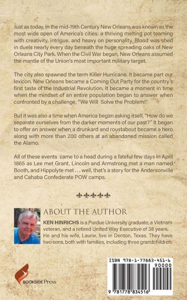 Just as today, in the mid-19th Century New Orleans was known as the most wide open of America's cities: a thriving melting pot teaming with creativity, intrigue, and heavy on personality. Blood was shed in duels nearly every day beneath the huge spreading oaks of New Orleans City Park. When the Civil War began, New Orleans assumed the mantle of the Union's most important military target. The city also spawned the term Killer Hurricane. It became part our lexicon. New Orleans became a Coming Out Party for the country's first taste of the Industrial Revolution. It became a moment in time when the mindset of an entire population began to answer when confronted by a challenge, "We Will Solve the Problem!" But it was also a time when America began asking itself, "How do we separate ourselves from the darker moments of our past?" It began to offer an answer when a drunkard and roustabout became a hero along with more than 200 others at an abandoned mission called the Alamo. All of these events came to a head during a fateful few days in April 1865 as Lee met Grant, Lincoln and Armstrong met a man named Booth, and Hippolyte met . . . well, that's a story for the Andersonville and Cahaba Confederate POW camps.