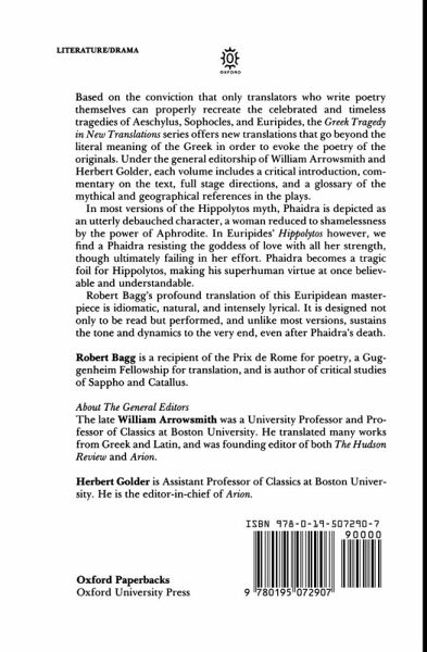 In most versions of the Hippolytos myth, Phaidra is depicted as an utterly debauched character, a woman reduced to shamelessness by the power of Aphrodite. In Euripides' Hippolytos, however--informed by the playwright's moral and religious fascination--we find a Phaidra resisting the goddess of love with all her strength, though in the end unsuccessfully. Phaidra becomes a tragic foil for Hippolytos, making his superhuman virtue at once believable and understandable. Robert Bagg's profound translation of this Euripidean masterpiece is idiomatic, natural, and intensely lyrical, designed not only to be read but performed. Unlike most versions, Bagg's Hippolytos sustains the dramatic tome and dynamics to the very end--even after Phaidra's death--and the moving scenes between Hippolytos and Theseus, and later Hippolytos' death-scene with Artemis, receive here unprecedented plausibility and power.