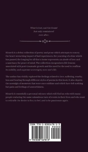 HIRAETH gently explore the feelings and life lessons associated with love, suffering, disappointment, cruelty, loss and healing. It depicts the nostalgia of a moment that was sublime and which has left nothing but pain and feelings of unworthiness. This collection is an attempt to empower the delicate men and women who, having been abandoned without concerns, consequences or care, are seeking some light in order to get out of the profound darkness of unexplained desertion, people who are trying to regain their self-confidence so that they learn to stop making excuses for the boorish behavior of others; that heartbreak and profound disappointment and melancholy can be transformational, as the broken down metamorphoses into the wholesome and nourishing again. In other words, every handicap, every letdown, every callous attempt on one's integrity does not need to cripple, but instead it pushes one to draw on one's inner strength and moral vibrancy when facing the coldness of rejection where once only warmth and comfort used to be.
