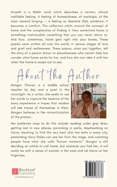 Hiraeth is a Welsh word which describes a certain, almost ineffable, feeling. A feeling of homesickness, of nostalgia, of the most visceral longing -- a feeling so desolate that, somehow, it becomes a comfort. This collection orbits around the concept of home and the complexities of finding it. How sometimes home is something irretrievable, something that you can never return to. And how, sometimes, home gets right into your bones. These poems were written all over the world, in various stages of love and grief and restlessness. These poems, when put together, tell the story of a person drawn to placelessness who cannot help but wonder what home exists for her, and how she can take it with her when the frame is swept out to sea.