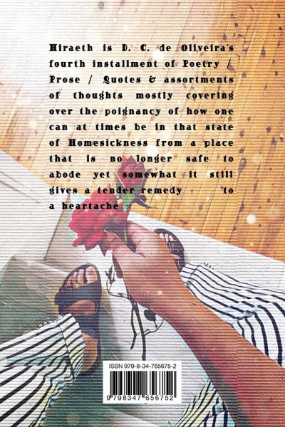 Hiraeth is D. C. de Oliveira's fourth installment of Poetry, Prose, Quotes and assortments of thoughts mostly covering over the poignancy of how one can at times be in that state of Homesickness from a place that is no longer safe to abode yet somewhat it still gives a tender remedy to a heartache --