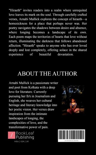 ""Hiraeth"" invites readers into a realm where unrequited love leaves its mark on the soul. Through carefully crafted verses, Arnabi Mallick explores the concept of hiraeth-a homesickness for a place that perhaps never was. Her poetry navigates the shadows between desire and absence, where longing becomes a landscape of its own. Each poem maps the territories of hearts that love without return, illuminating the darkness that follows abandoned affection. ""Hiraeth"" speaks to anyone who has ever loved deeply and lost completely, offering solace in the shared experience of beautiful devastation.