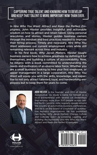 In Hire Who You Want, John Hiester provides insightful and actionable wisdom on how to attract and retain talent. Using personal anecdotes and stories, John guides business owners through the mindset and best practices needed to improve their hiring process. Timely and necessary, Hire Who You Want addresses our current employment crisis while still remaining relevant across time and industry. In John Hiester's first book Why Jacob Matters, he taught business owners how to achieve greatness by defining it for themselves, and building a culture of accountability. Now, he returns with a book committed to understanding the needs and motivators of an elusive labor force. Whether you are a small business looking to hire your first employee, or upper management in a large corporation, Hire Who You Want will equip you with the skills, knowledge, and expertise to not only attract talented, loyal, and hardworking employees but how to keep them for years to come. John Hiester is the founder and CEO of Hiester Automotive. He is an award-winning speaker, author, and business owner.