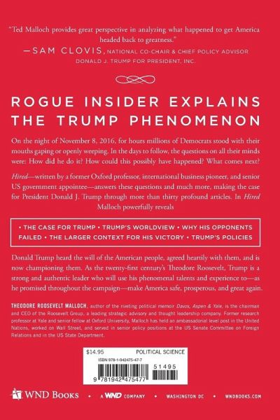 Donald Trump’s victory is a movement against the establishment and in Hired that movement is best explained. "Just as Brexiteers mobilized a people’s army, so too has Mr. Trump mobilized the people in the United States. Brexit is a story of a grassroots campaign, of putting on one’s walking boots on, delivering leaflets, and going out to meet people in their communities. The same way that Donald J. Trump mobilized people in the United States" (from the Afterword by Nigel Farage). On the night of November 8, for hours millions of Democrats stood with their mouth gaping or openly weeping. In the days to follow, the questions on all their minds were How did he do it? Why did it happen? Hired, answers these questions and more as it makes the case for Donald J. Trump through a collection of astute articles by former Oxford professor and senior US government appointee. In more than thirty profound pieces, Dr. Theodore Roosevelt Malloch explainsthe case for Trump, Trump’s worldview, why his opponents failed, the context for his victory, and Trump’s policies. Trump heard the will of the people and identified with them. As the twenty-first century Theodore Roosevelt, Trump is a strong and authentic leader who will fix America, defend America, and make it great again.
