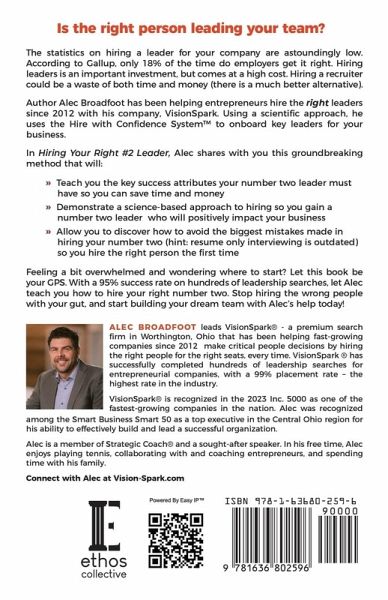 #1 Bestseller Is the right person leading your team? The statistics on hiring a leader for your company are astoundingly low. According to Gallup, only 18% of the time do employers get it right. Hiring leaders is an important investment, but comes at a high cost. Hiring a recruiter could be a waste of both time and money (there is a much better alternative). Author Alec Broadfoot has been helping entrepreneurs hire the "right" leaders since 2012 with his company, VisionSpark. Using a scientific approach, he uses the Hire with Confidence System¿ to onboard key leaders for your business. In Hiring Your Right #2 Leader, Alec shares with you this groundbreaking method that will: Teach you the key success attributes your number two leader must have so you can save time and money Demonstrate a science-based approach to hiring so you gain a number two leader who will positively impact your business Allow you to discover how to avoid the biggest mistakes made in hiring your number two (hint: resume-only interviewing is outdated) so you hire the right person the first time Feeling a bit overwhelmed and wondering where to start? Let this book be your GPS. With a 95% success rate on hundreds of leadership searches, let Alec teach you how to hire your right number two. Stop hiring the wrong people with your gut, and start building your dream team with Alec's help today!