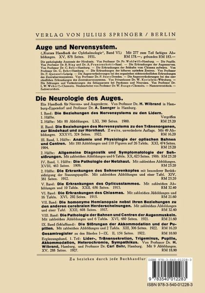 Symptomatologie der Erkrankungen des Riechnerven.- Anatomische Vorbemerkungen.- Methodische Vorbemerkungen.- Physiologische Vorbemerkungen.- Psychologische Vorbemerkungen.- Klinik.- Literatur.- Symptomatologie der Erkrankungen der Riechrinde.- Vorbemerkungen.- Geruchshalluzinationen.- Geruchsausfälle, Agnosien.- Literatur.- Symptomatologie der Erkrankungen des Nervus opticus (einschl. Stauungspapille).- A. Einleitung.- B. Stauungspapille.- I. Stauungspapille bei cerebralen Erkrankungen.- II. Stauungspapille bei Allgemeinleiden.- III. Stauungspapille bei Orbitalaffektionen.- IV. Stauungspapille aus okularer Ursache.- C. Neuritis nervi optici.- I. Neuritis vom Typ der Encephalitis.- II. Neuritis vom Typ der Pseudoencephalitis.- D. Atrophia nervi optici. (Die degenerativen Prozesse im Opticus).- Ursachen der blanden Sehnervenatrophie.- E. Tumoren des Sehnerven.- Literatur.- Untersuchungsmethoden der optischen Funktionen.- Vorwort.- Vorbemerkung.- I. Prüfung des zentralen Sehvermögens.- II. Licht- und Farbensinn.- III. Indirektes, extramaculäres Sehen.- IV. Methoden zur Untersuchung des binokularen Sehens.- V. Untersuchungsmethoden bei Simulation und Aggravation.- Literatur.- Symptomatologie der Störungen im Augenbewegungsapparat.- I. Der sensorische Apparat des Doppelauges.- II Der motorische Apparat des Doppelauges.- III. Die Lähmungen der einzelnen Augenmuskeln.- IV. Ein- und doppelseitige Ophthalmoplegien.- V. Die assoziierten (Blick-)Lähmungen.- VI. Die Ataxie der Augenbewegungen.- VII. Die Störungen der Augenbewegungen bei Hysterie (Psychoneurosen).- VIII. Die kongenitalen Bewegungsstörungen.- IX. Die Krämpfe der Augenmuskeln.- X. Nystagmus.- Literatur.- Pupille.- A. Anatomie.- B. Physiologie der Pupillenbewegungen.- C. Pharmakologie.- D. Pathologie derPupillenbewegungen.- E. Untersuchungsmethoden.- Literatur.- Symptomatologie der Erkrankung des V., VII., IX., XI. und XII. Hirnnerven.- I. Nervus trigeminus.- II. Nervus facialis.- III. Nervus vagus.- IV. Nervus glossopharyngeus.- V. Nervus accessorius.- VI. Nervus hypoglossus.- Literatur.- Symptomatologie der Erkrankungen des N. VIII einschl. Leitung im Hirnstamm.- A. Anatomisch-physiologische und klinische Vorbemerkungen.- B. Allgemeines über Symptome und Untersuchung der beiden Äste des N. acusticus.- C. Symptomatologie des R. cochlearis einschließlich seiner Untersuchung.- D. Die Symptomatologie des Ramus vestibularis einschließlich seiner Untersuchung.- E. Bedeutung einiger Symptome. Kombinationen des N. VIII, insbesondere seiner beiden Äste untereinander.- Literatur.- Namenverzeichnis.